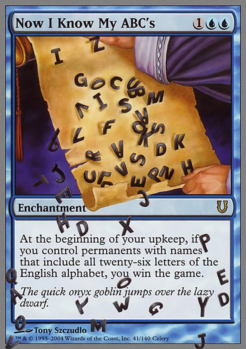 Magic: the Gathering (mtg) Rare Enchantment Now I Know My ABC's from Unhinged (UNH) last updated 2026-02-24 15:52:32