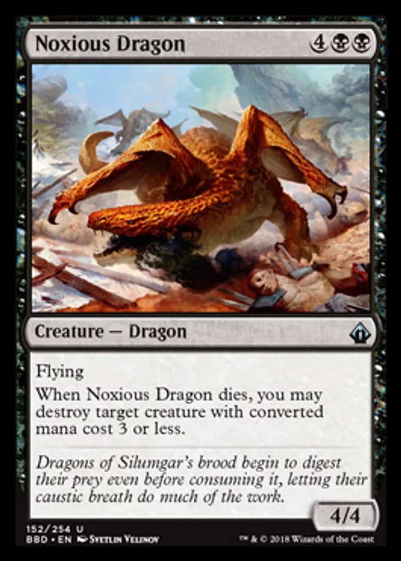 | Oracle Text | Flying When Noxious Dragon dies, you may destroy target creature with converted mana cost 3 or less. | ||