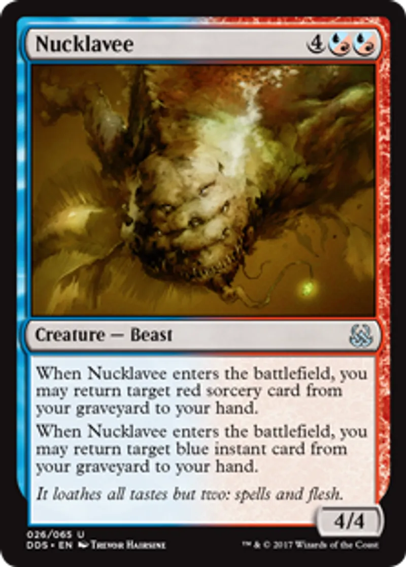 | Oracle Text | When Nucklavee enters the battlefield, you may return target red sorcery card from your graveyard to your hand. When Nucklavee enters the battlefield, you may return target blue instant card from your graveyard to your hand. | ||
