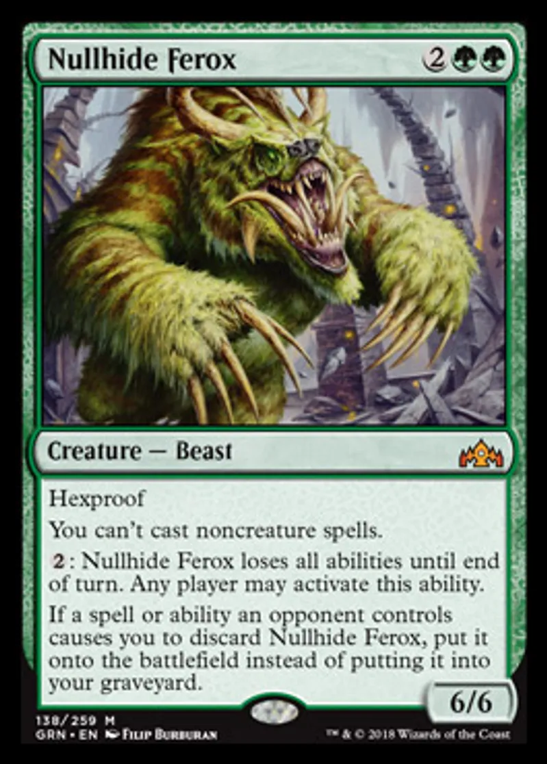 | Oracle Text | Hexproof You can't cast noncreature spells. {{2}}: Nullhide Ferox loses all abilities until end of turn. Any player may activate this ability. If a spell or ability an opponent controls causes you to discard Nullhide Ferox, put it onto the battlefield instead of putting it into your graveyard. | ||