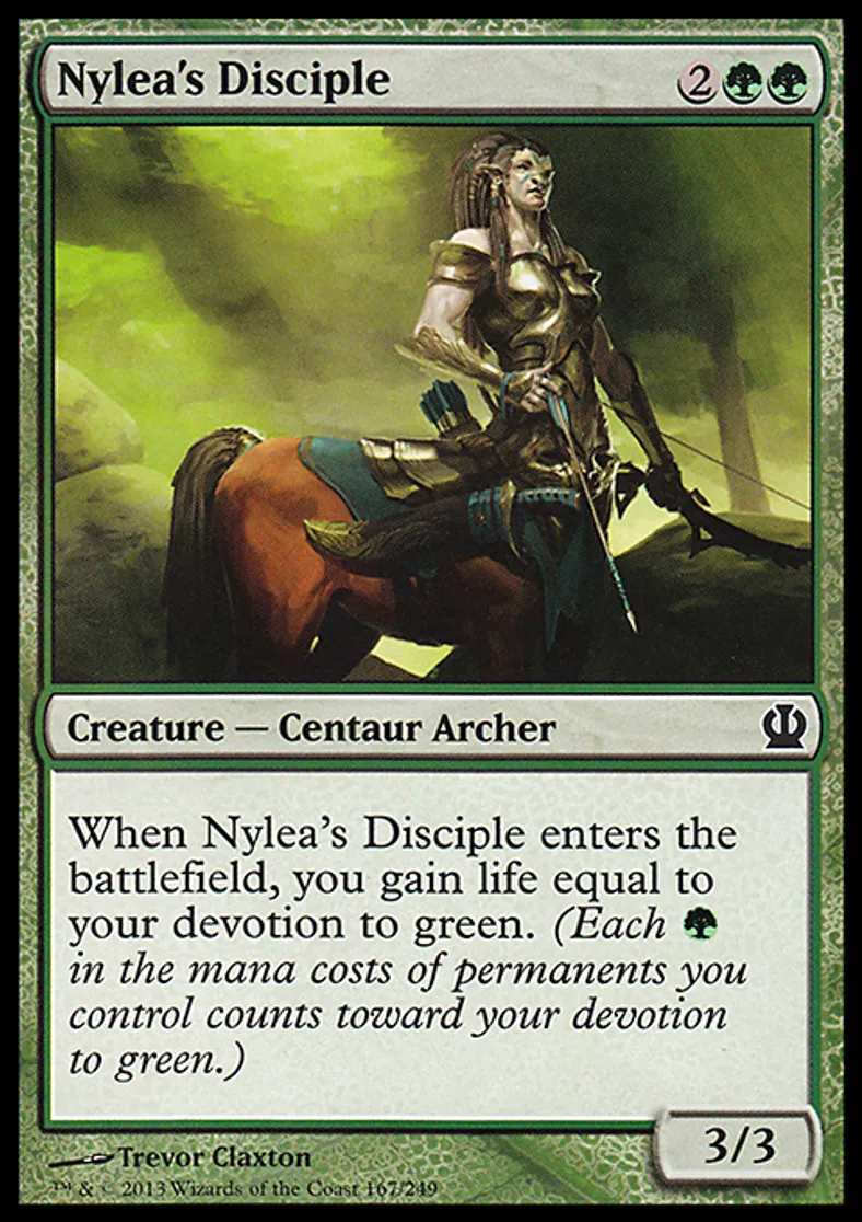 | Oracle Text | When Nylea's Disciple enters the battlefield, you gain life equal to your devotion to green. (Each {{g}} in the mana costs of permanents you control counts toward your devotion to green.) | ||