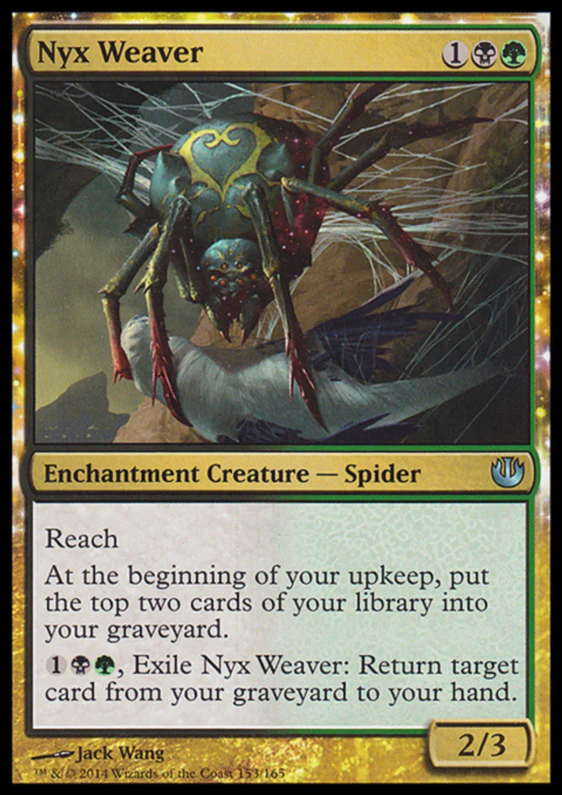 | Oracle Text | Reach At the beginning of your upkeep, put the top two cards of your library into your graveyard. {{1}}{{b}}{{g}}, Exile Nyx Weaver: Return target card from your graveyard to your hand. | ||