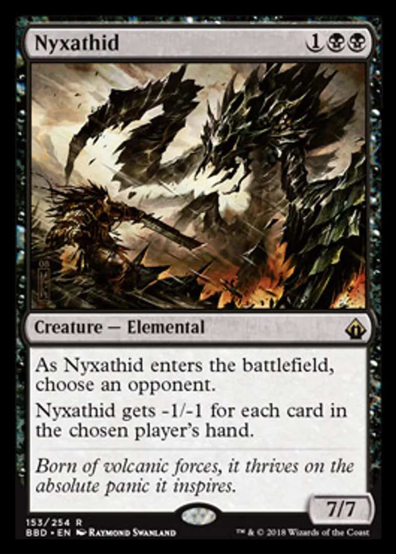 | Oracle Text | As Nyxathid enters the battlefield, choose an opponent. Nyxathid gets -1/-1 for each card in the chosen player's hand. | ||