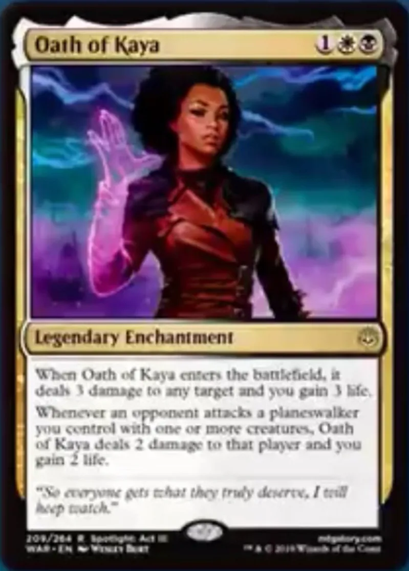 | Oracle Text | When Oath of Kaya enters the battlefield, it deals 3 damage to any target and you gain 3 life.