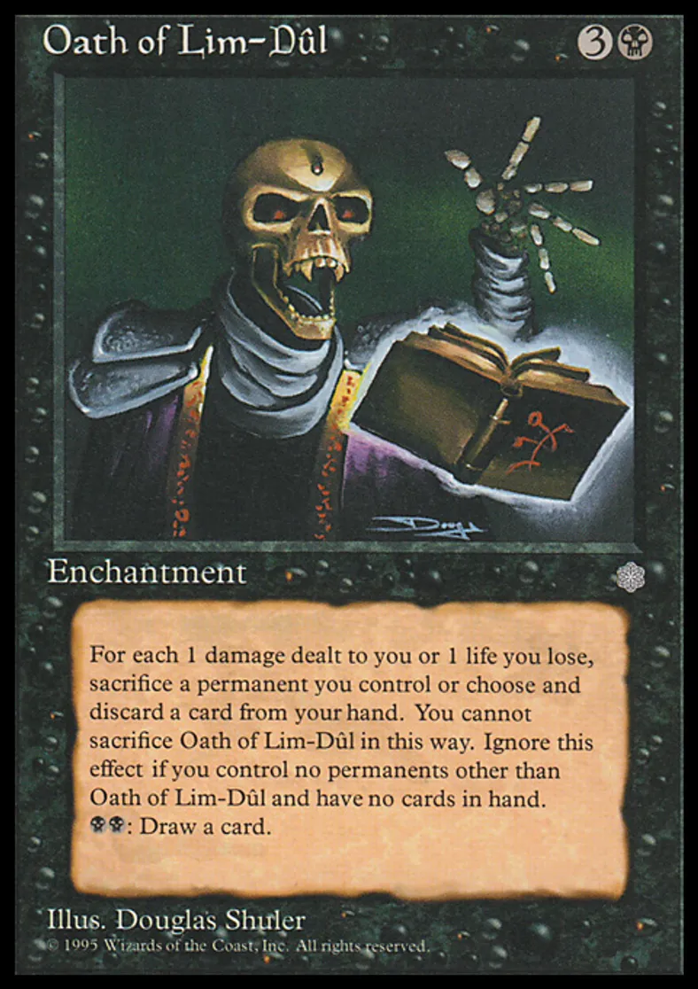| Oracle Text | Whenever you lose life, for each 1 life you lost, sacrifice a permanent other than Oath of Lim-Dûl unless you discard a card. (Damage dealt to you causes you to lose life.) {{b}}{{b}}: Draw a card. | ||