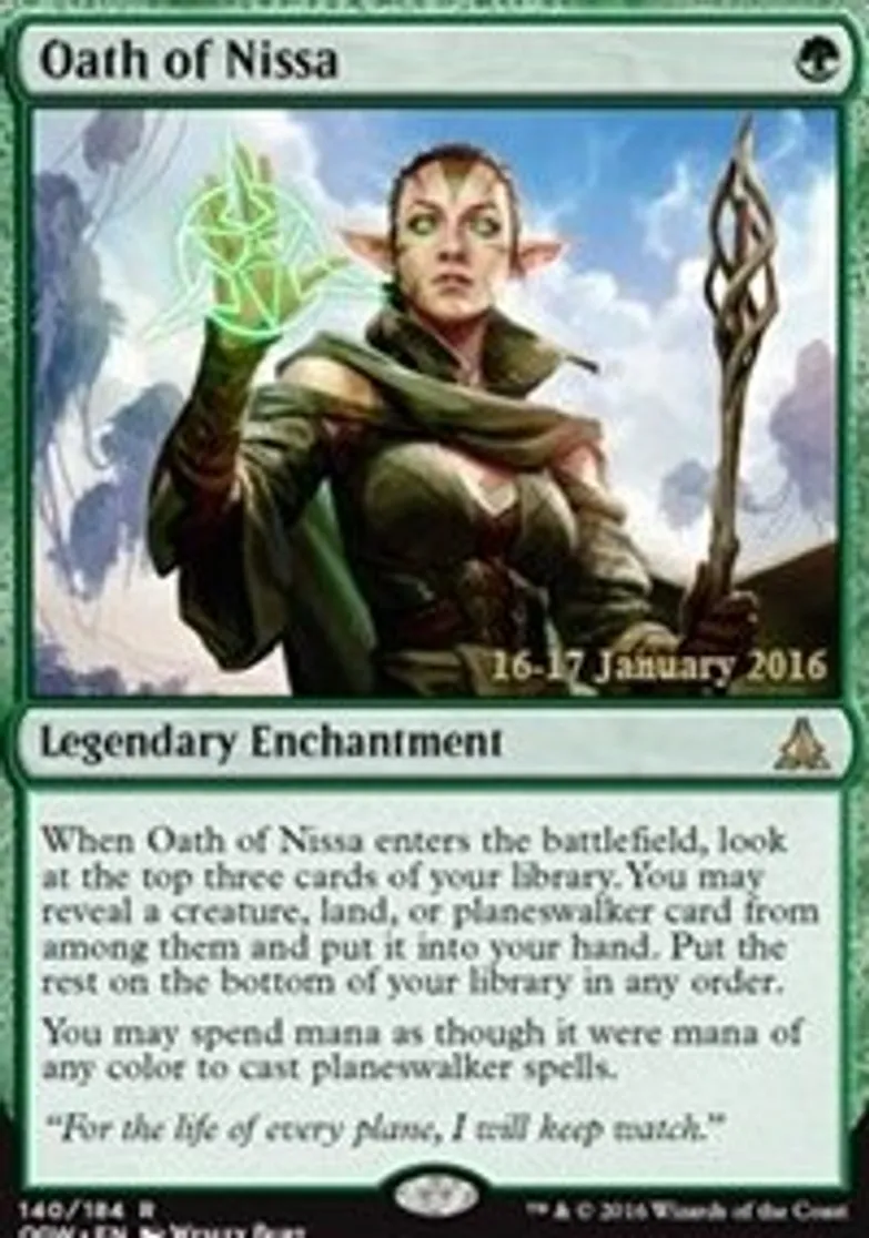 | Oracle Text | When Oath of Nissa enters the battlefield, look at the top three cards of your library. You may reveal a creature, land, or planeswalker from among them and put them into your hand. Put the rest on the bottom of your library in any order.