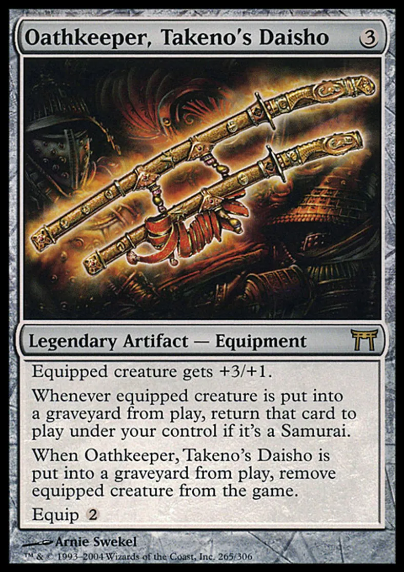 | Oracle Text | Equipped creature gets +3/+1. Whenever equipped creature dies, return that card to the battlefield under your control if it's a Samurai card. When Oathkeeper, Takeno's Daisho is put into a graveyard from the battlefield, exile equipped creature. Equip {{2}} | ||