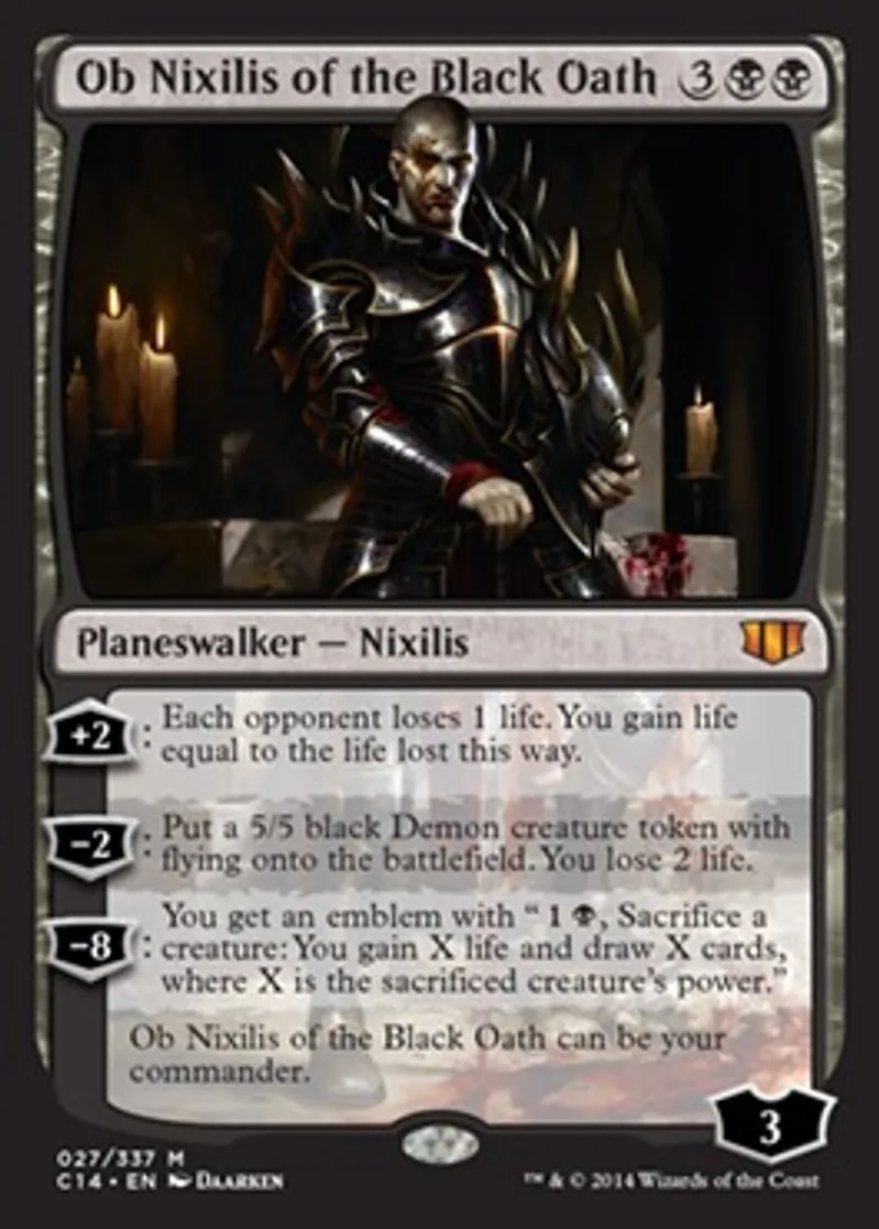 | Oracle Text | +2: Each opponent loses 1 life. You gain life equal to the life lost this way. −2: Put a 5/5 black Demon creature token with flying onto the battlefield. You lose 2 life. −8: You get an emblem with "{{1}}{{b}}, Sacrifice a creature: You gain X life and draw X cards, where X is the sacrificed creature's power." Ob Nixilis of the Black Oath can be your commander. | ||