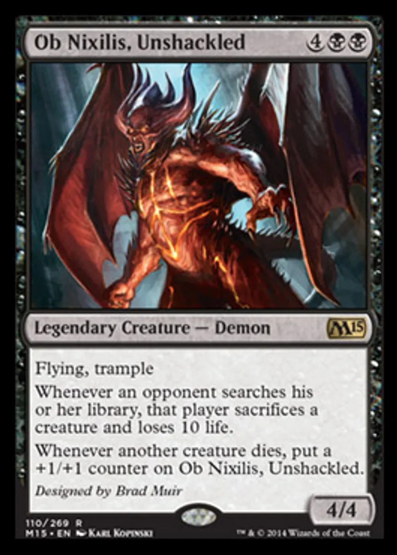 | Oracle Text | Flying, trample Whenever an opponent searches his or her library, that player sacrifices a creature and loses 10 life. Whenever another creature dies, put a +1/+1 counter on Ob Nixilis, Unshackled. | ||