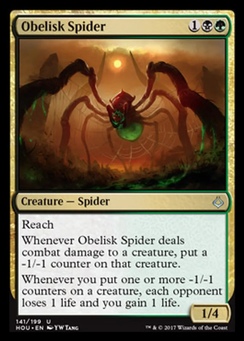 | Oracle Text | Reach Whenever Obelisk Spider deals combat damage to a creature, put a -1/-1 counter on that creature. Whenever you put one or more -1/-1 counters on a creature, each opponent loses 1 life and you gain 1 life. | ||