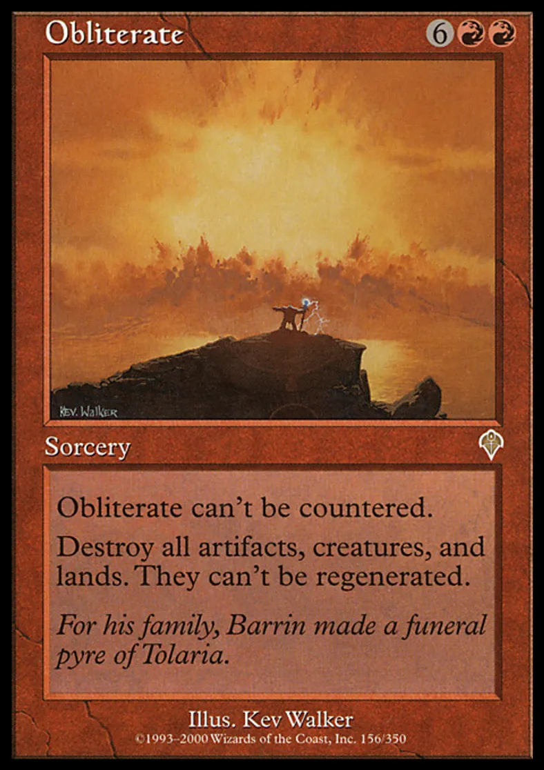 | Oracle Text | Obliterate can't be countered. Destroy all artifacts, creatures, and lands. They can't be regenerated. | ||