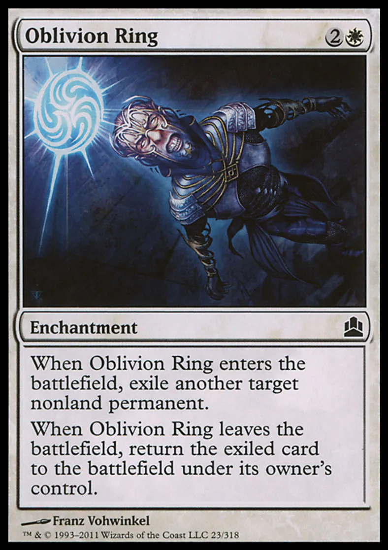 | Oracle Text | When Oblivion Ring enters the battlefield, exile another target nonland permanent. When Oblivion Ring leaves the battlefield, return the exiled card to the battlefield under its owner's control. | ||