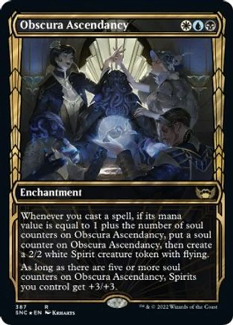 | Oracle Text | Whenever you cast a spell, if its mana value is equal to 1 plus the number of soul. counters on Obscura Ascendancy, put a soul counter on Obscura Ascendancy, then create a 2/2 white Spirit creature token with flying.