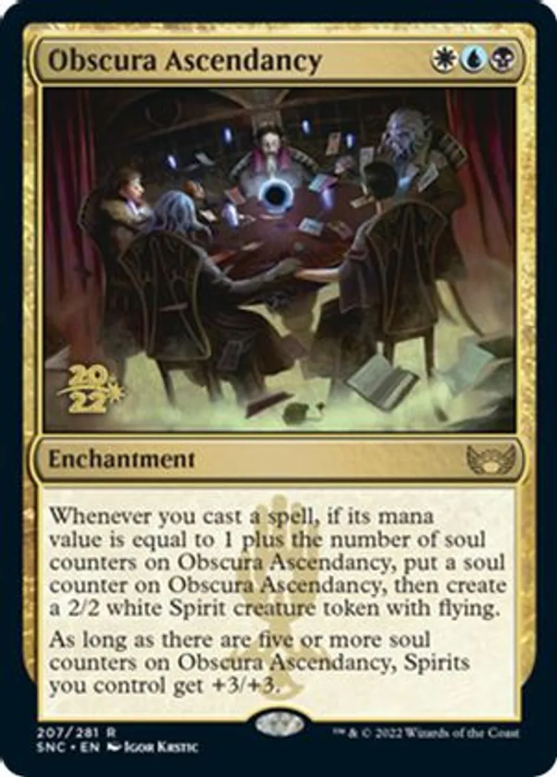 | Oracle Text | Whenever you cast a spell, if its mana value is equal to 1 plus the number of soul. counters on Obscura Ascendancy, put a soul counter on Obscura Ascendancy, then create a 2/2 white Spirit creature token with flying.