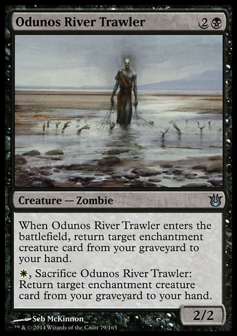 | Oracle Text | When Odunos River Trawler enters the battlefield, return target enchantment creature card from your graveyard to your hand. {{w}}, Sacrifice Odunos River Trawler: Return target enchantment creature card from your graveyard to your hand. | ||