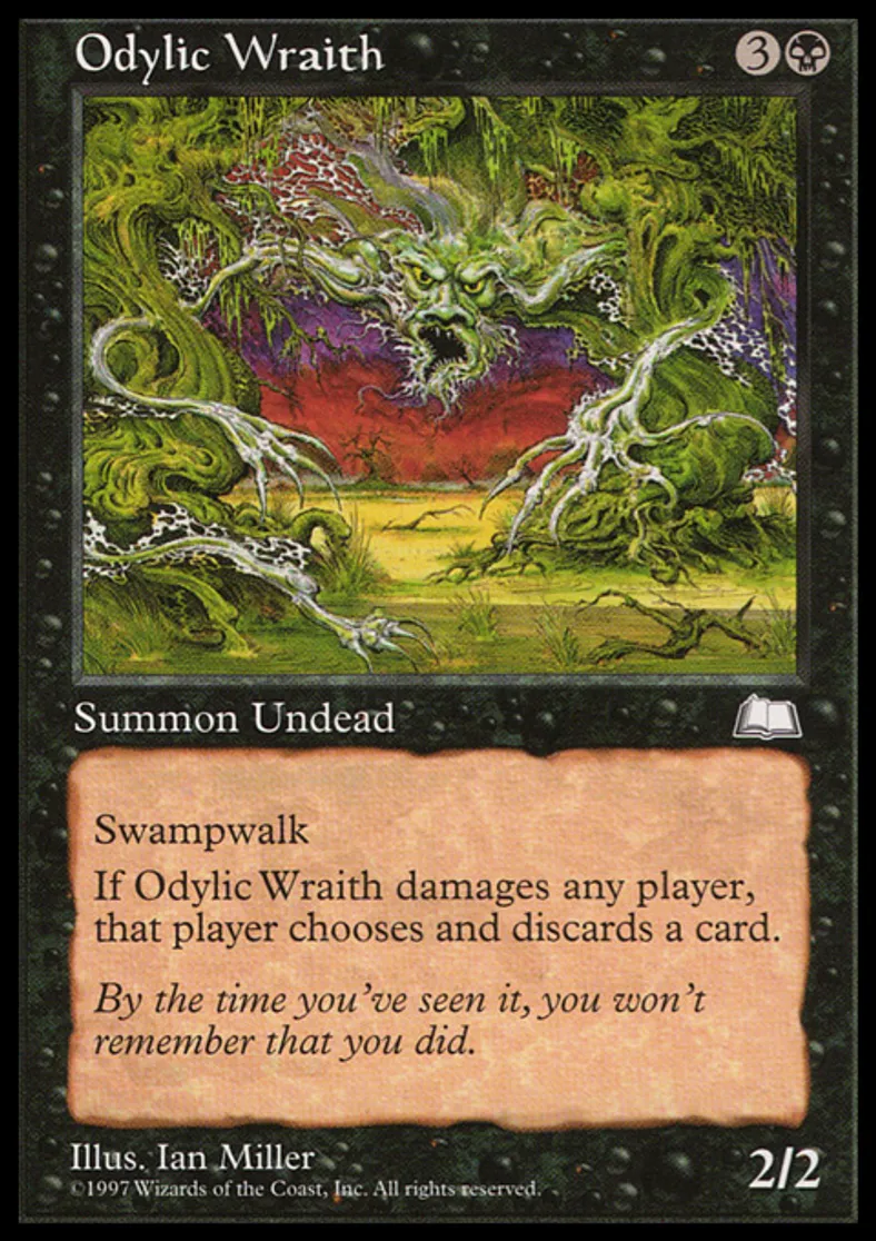 | Oracle Text | Swampwalk Whenever Odylic Wraith deals damage to a player, that player discards a card. | ||