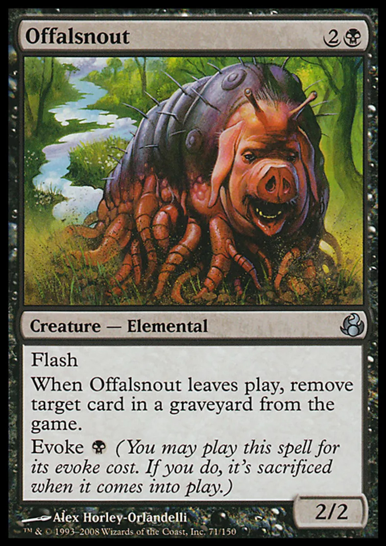 | Oracle Text | Flash When Offalsnout leaves the battlefield, exile target card from a graveyard. Evoke {{b}} (You may cast this spell for its evoke cost. If you do, it's sacrificed when it enters the battlefield.) | ||