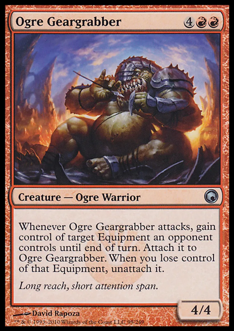 | Oracle Text | Whenever Ogre Geargrabber attacks, gain control of target Equipment an opponent controls until end of turn. Attach it to Ogre Geargrabber. When you lose control of that Equipment, unattach it. | ||