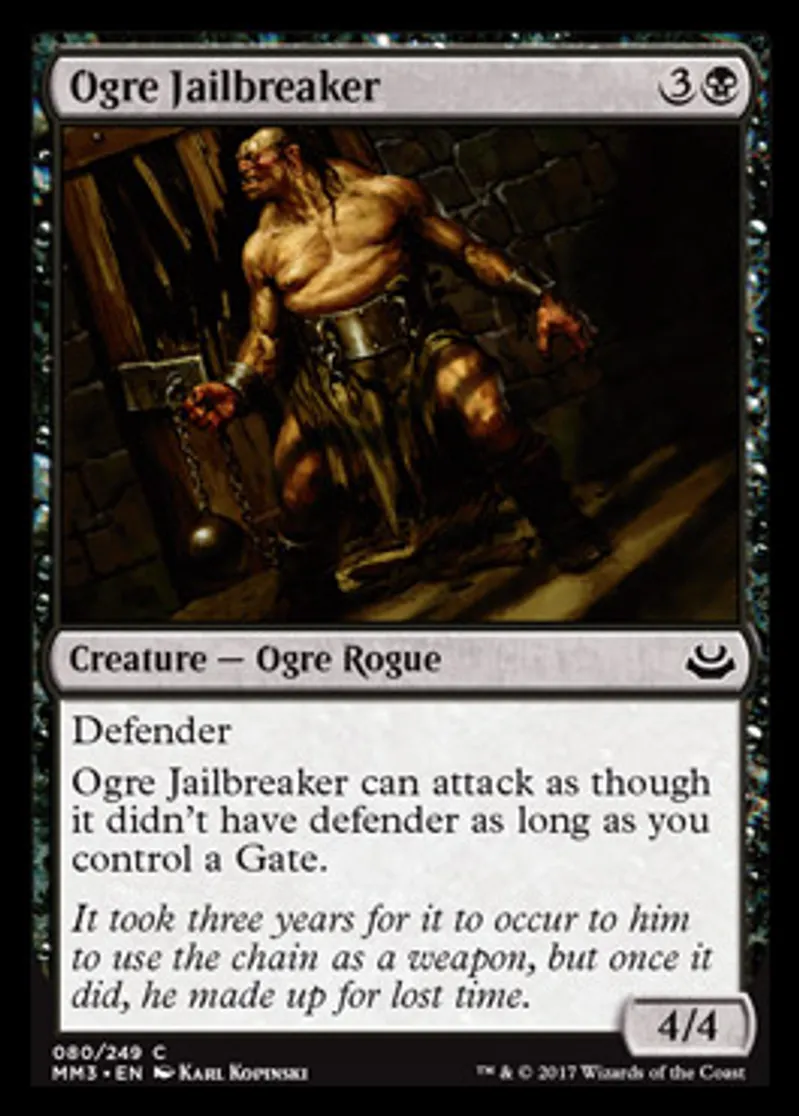 | Oracle Text | Defender Ogre Jailbreaker can attack as though it didn't have defender as long as you control a Gate. | ||