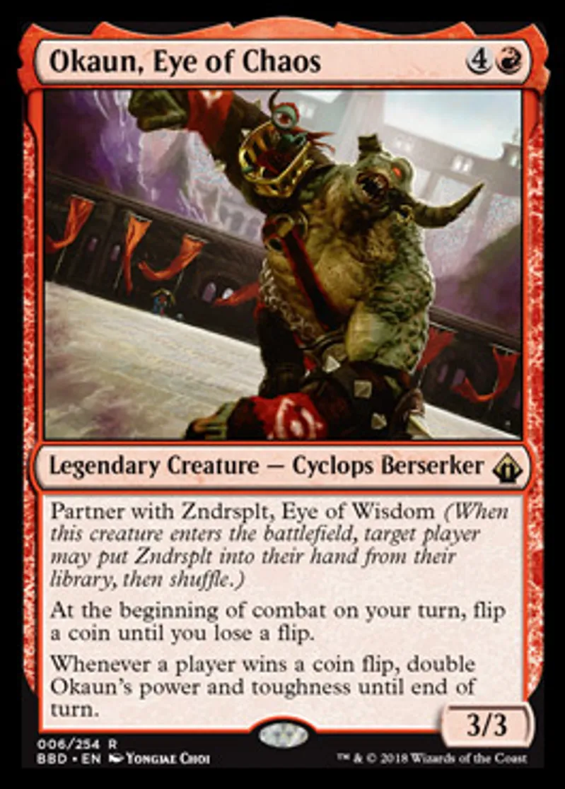 | Oracle Text | Partner with Zndrsplt, Eye of Wisdom (When this creature enters the battlefield, target player may put Zndrsplt into their hand from their library, then shuffle.) At the beginning of combat on your turn, flip a coin until you lose a flip. Whenever a player wins a coin flip, double Okaun's power and toughness until end of turn. | ||