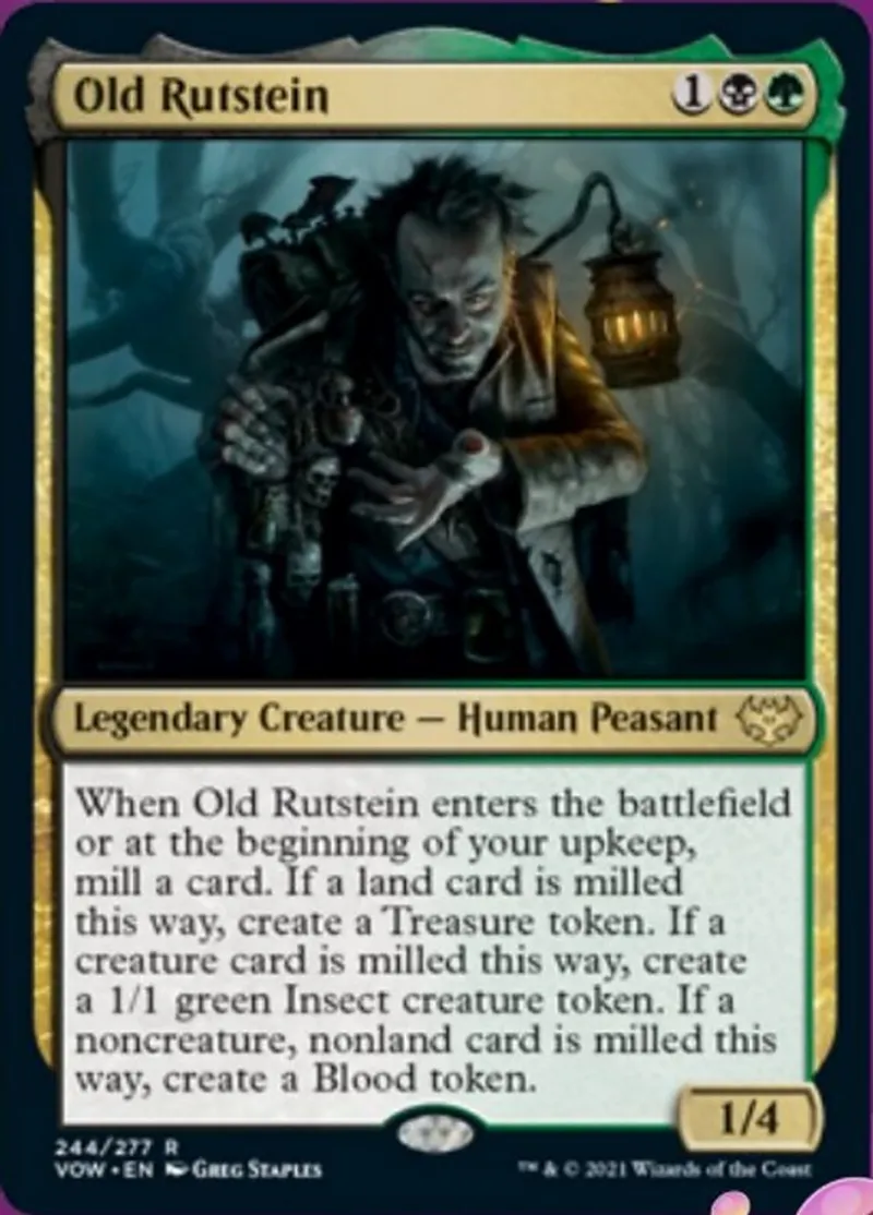 | Oracle Text | When Old Rutstein enters the battlefield or at the beginning of your upkeep, mill a card. If a land card is milled this way, create a Treasure token. If a creature card is milled this way, create a 1/1 green Insect creature token. If a noncreature, nonland card is milled this way, create a Blood token. | ||