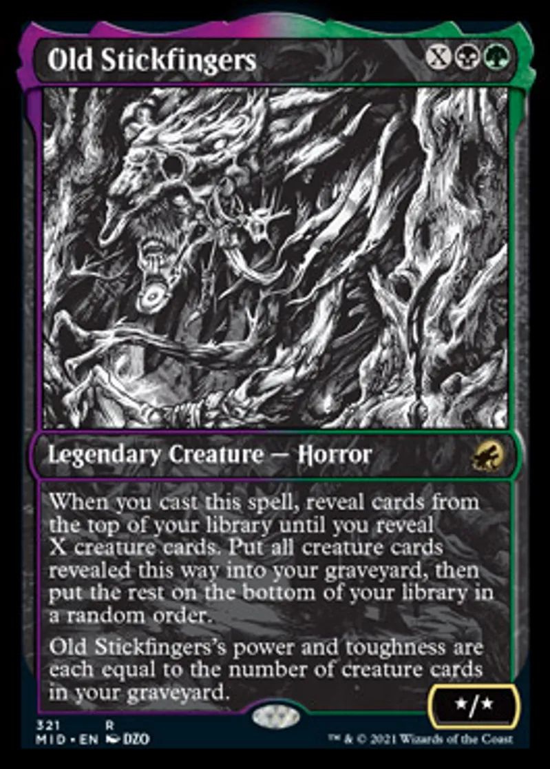 Magic: the Gathering (mtg) Rare Legendary Creature - Horror Old Stickfingers from Innistrad: Midnight Hunt (MID) last updated 2026-02-24 15:34:01