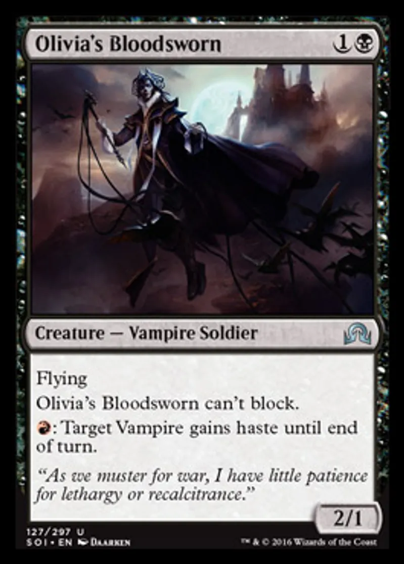 | Oracle Text | Flying Olivia's Bloodsworn can't block. {{r}}: Target Vampire gains haste until end of turn. | ||