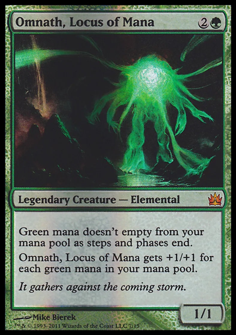 | Oracle Text | Green mana doesn't empty from your mana pool as steps and phases end. Omnath, Locus of Mana gets +1/+1 for each green mana in your mana pool. | ||