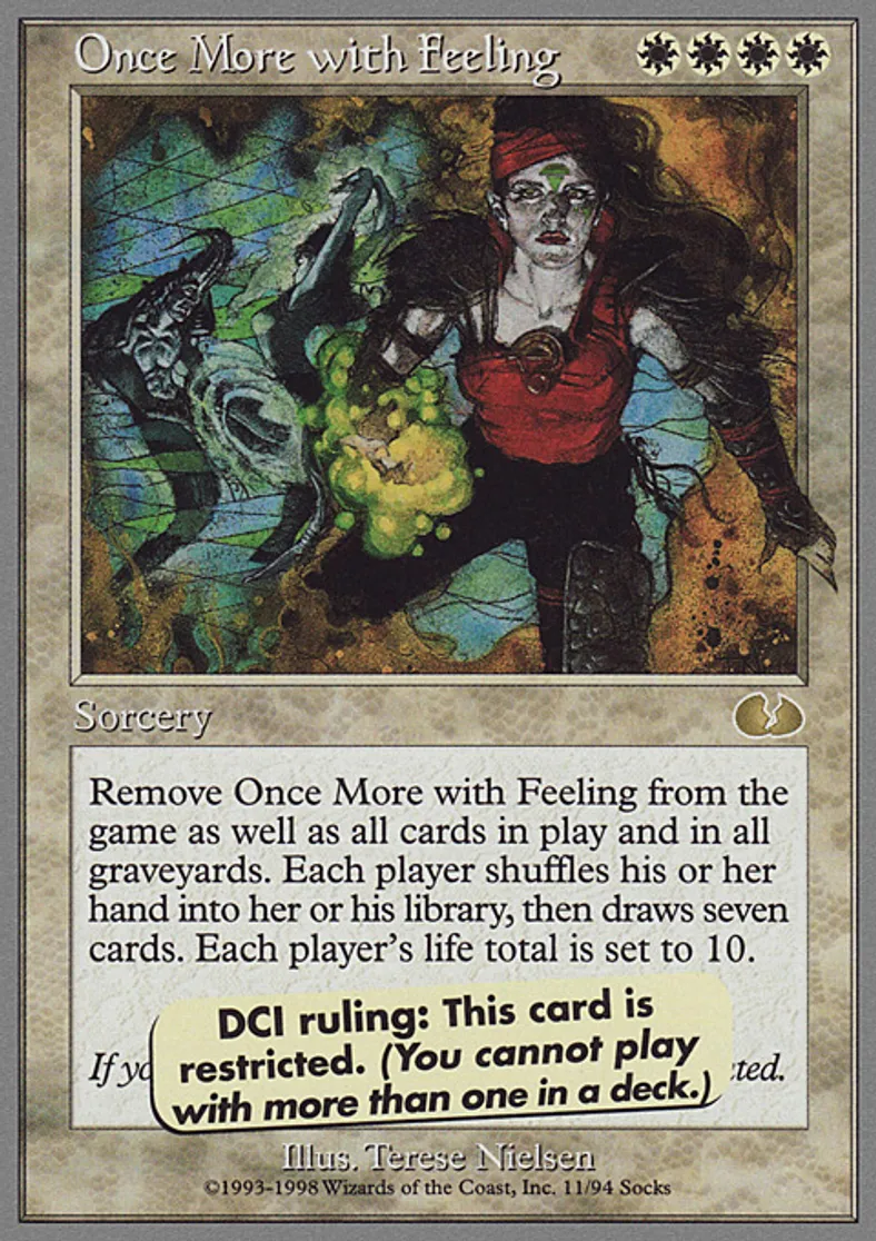 | Oracle Text | Remove Once More with Feeling from the game as well as all cards in play and in all graveyards. Each player shuffles his or her hand into her or his library, then draws seven cards. Each player's life total is set to 10. DCI ruling: This card is restricted. (You cannot play with more than one in a deck.) | ||
