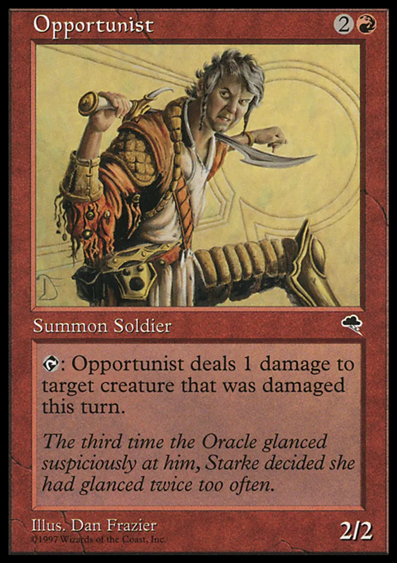 | Oracle Text | {{t}}: Opportunist deals 1 damage to target creature that was dealt damage this turn. | ||