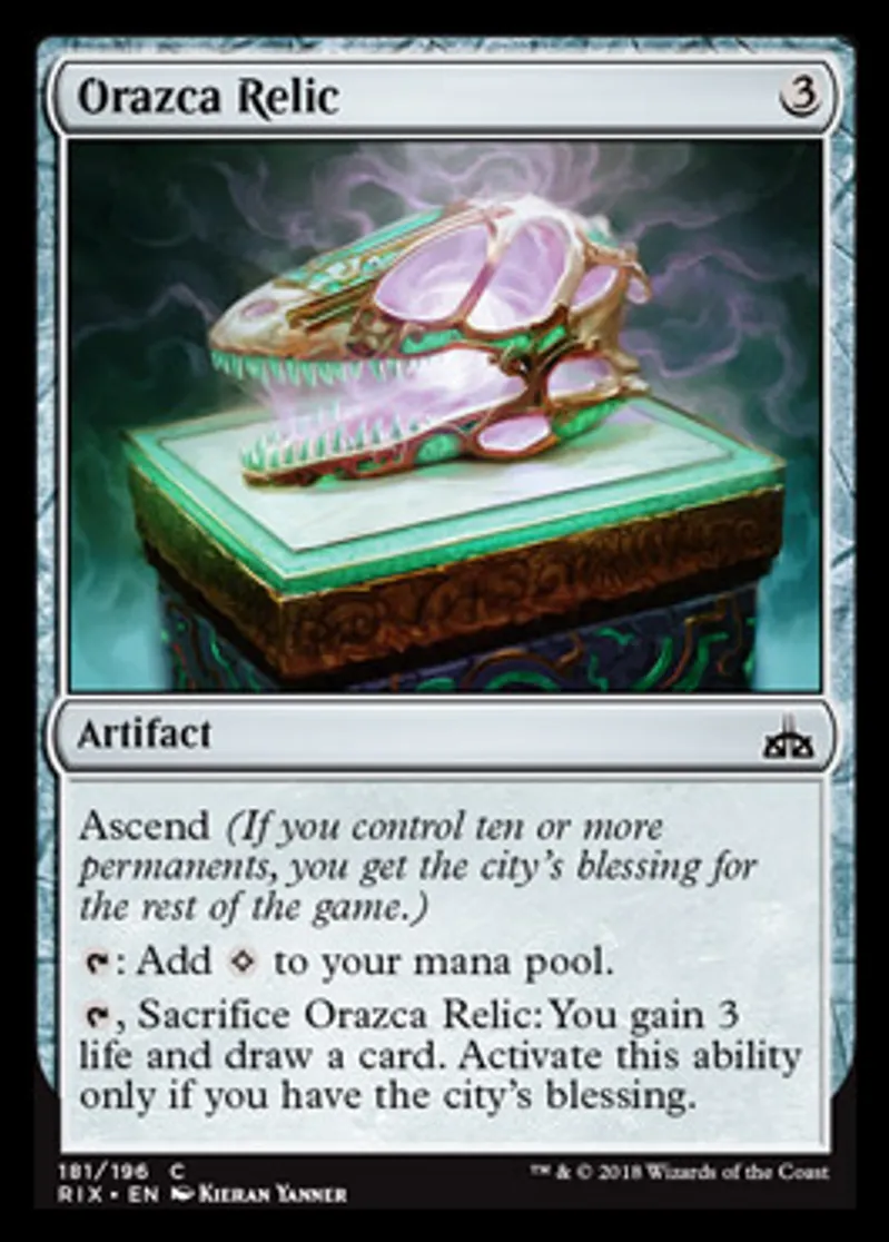 | Oracle Text | Ascend (If you control ten or more permanents, you get the city's blessing for the rest of the game.) {{t}}: Add {{Colorless}} to your mana pool. {{t}}, Sacrifice Orazca Relic: You gain 3 life and draw a card. Activate this ability only if you have the city's blessing. | ||
