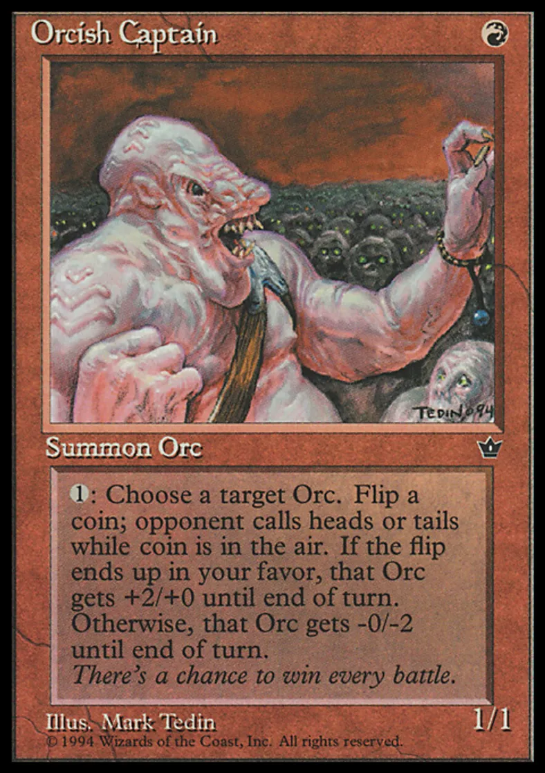 | Oracle Text | {{1}}: Flip a coin. If you win the flip, target Orc creature gets +2/+0 until end of turn. If you lose the flip, it gets -0/-2 until end of turn. | ||