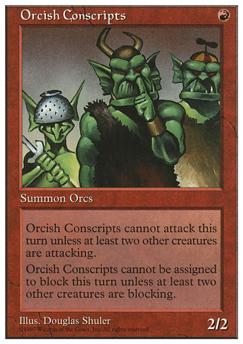| Oracle Text | Orcish Conscripts can't attack unless at least two other creatures attack. Orcish Conscripts can't block unless at least two other creatures block. | ||