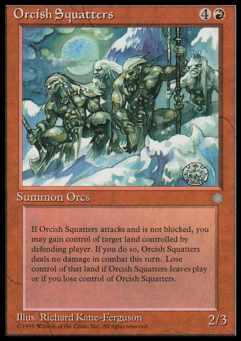| Oracle Text | Whenever Orcish Squatters attacks and isn't blocked, you may gain control of target land defending player controls for as long as you control Orcish Squatters. If you do, Orcish Squatters assigns no combat damage this turn. | ||