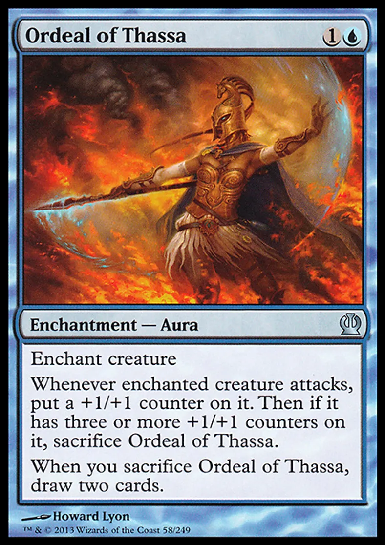 | Oracle Text | Enchant creature Whenever enchanted creature attacks, put a +1/+1 counter on it. Then if it has three or more +1/+1 counters on it, sacrifice Ordeal of Thassa. When you sacrifice Ordeal of Thassa, draw two cards. | ||