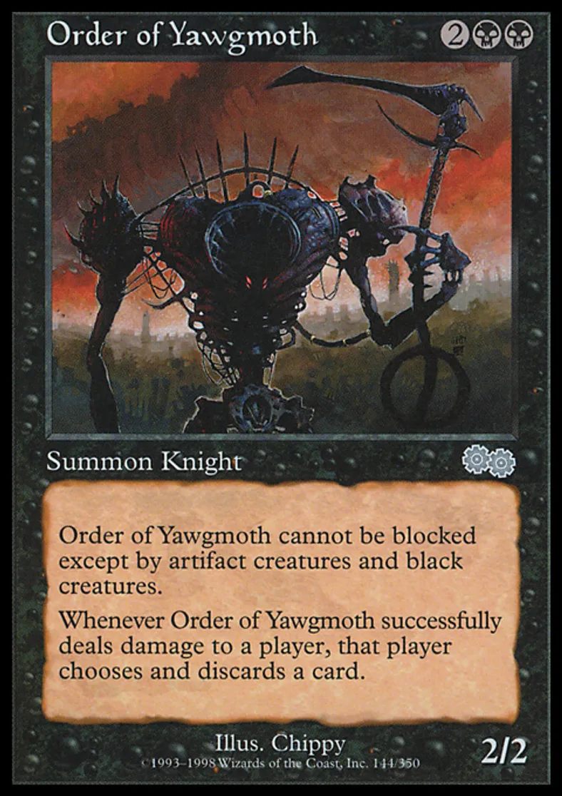| Oracle Text | Fear (This creature can't be blocked except by artifact creatures and/or black creatures.) Whenever Order of Yawgmoth deals damage to a player, that player discards a card. | ||