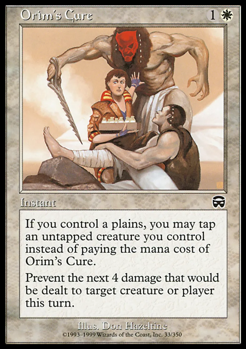 | Oracle Text | If you control a Plains, you may tap an untapped creature you control rather than pay Orim's Cure's mana cost. Prevent the next 4 damage that would be dealt to target creature or player this turn. | ||