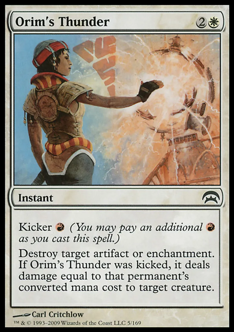 | Oracle Text | Kicker {{r}} (You may pay an additional {{r}} as you cast this spell.) Destroy target artifact or enchantment. If Orim's Thunder was kicked, it deals damage equal to that permanent's converted mana cost to target creature. | ||