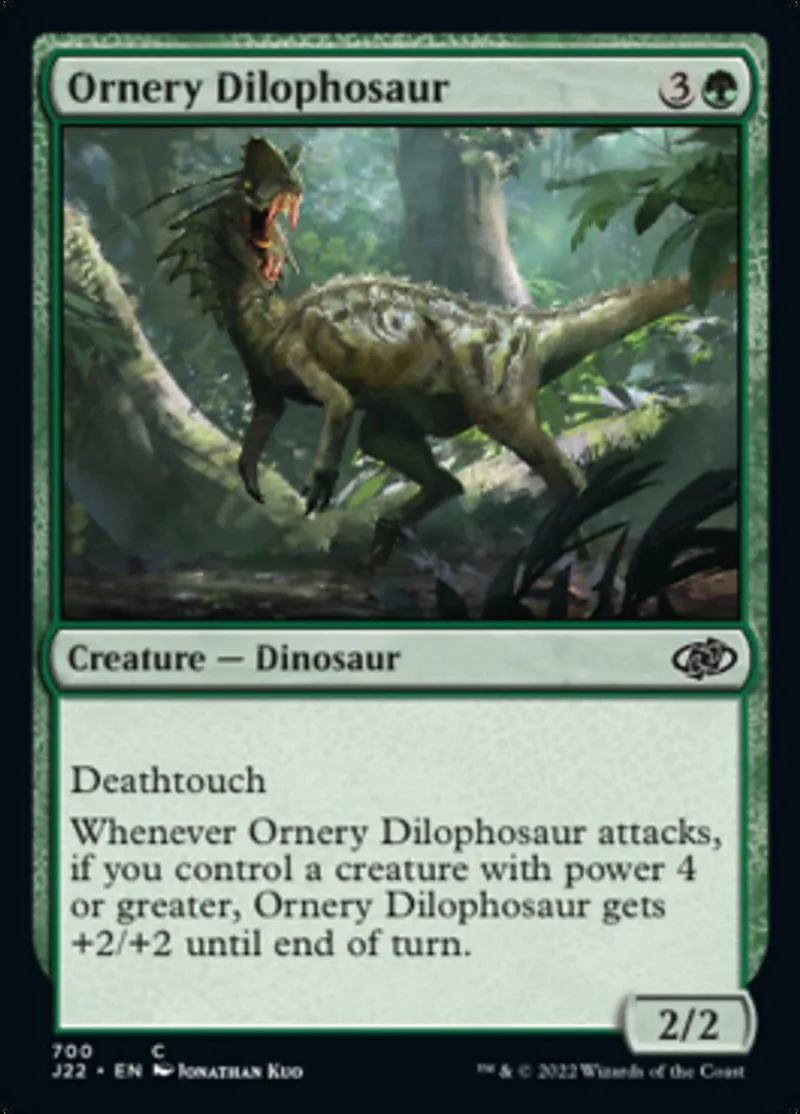 Magic: the Gathering (mtg) common Creature — Dinosaur Ornery Dilophosaur from Jumpstart 2022 (j22) last updated 2026-02-21 16:18:02