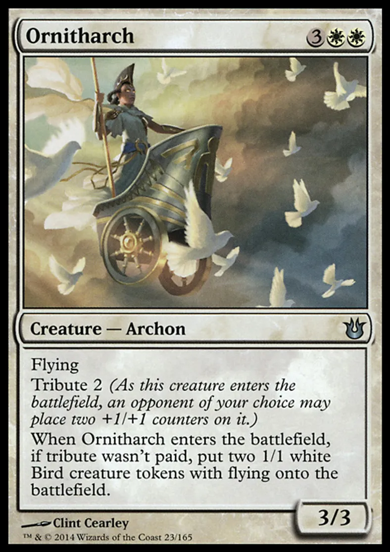 | Oracle Text | Flying Tribute 2 (As this creature enters the battlefield, an opponent of your choice may place two +1/+1 counters on it.) When Ornitharch enters the battlefield, if tribute wasn't paid, put two 1/1 white Bird creature tokens with flying onto the battlefield. | ||