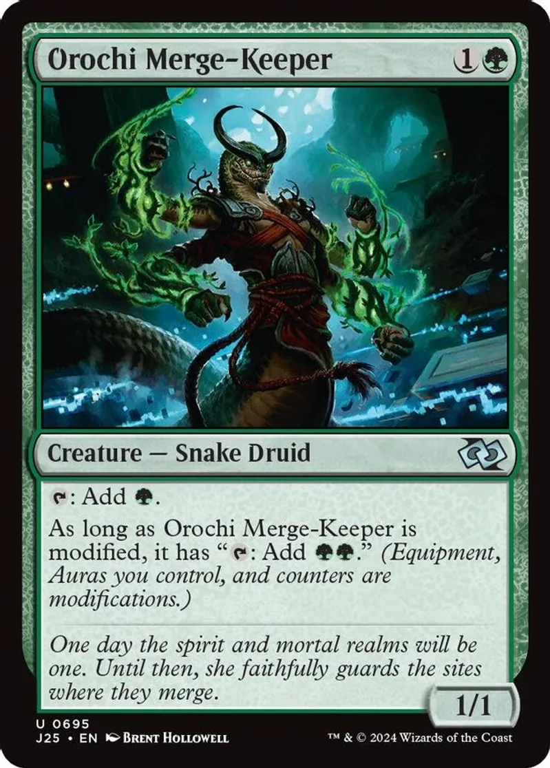 Magic: the Gathering (mtg) Uncommon creature — snake druid Orochi Merge-Keeper from Foundations Jumpstart (J25) last updated 2025-12-13 15:33:06