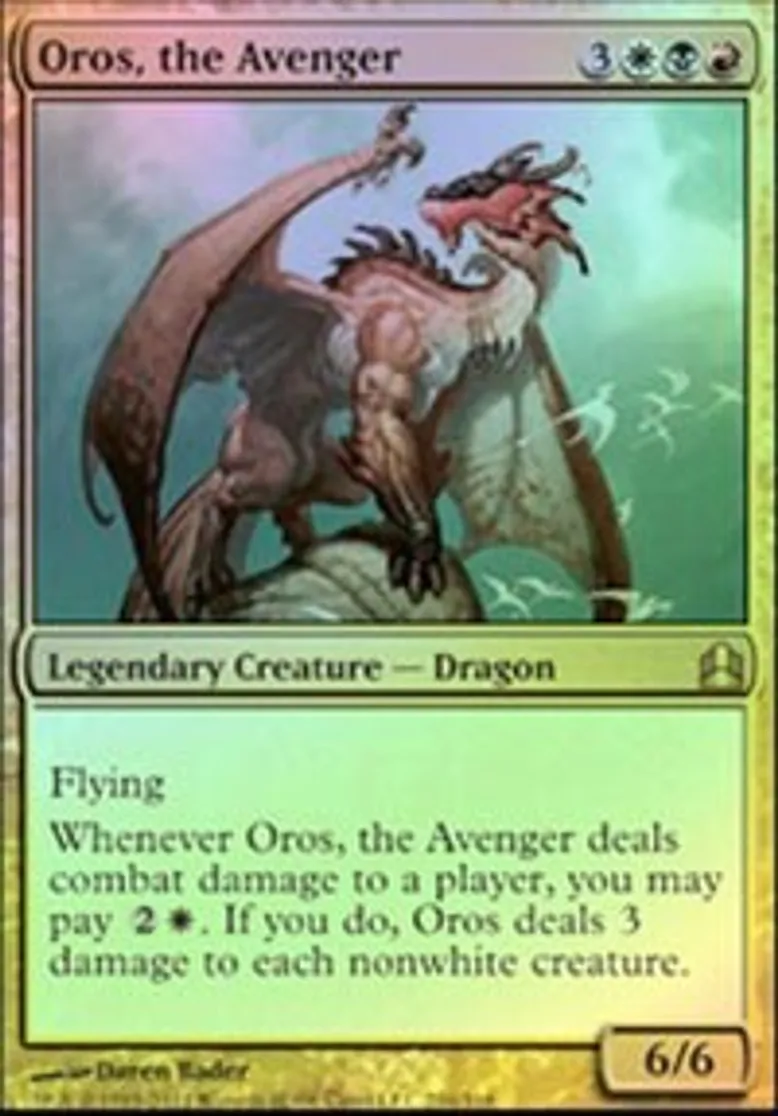 | Oracle Text | Flying Whenever Oros, the Avenger deals combat damage to a player, you may pay {{2}}{{W}}. If you do, Oros deals 3 damage to each nonwhite creature. | ||