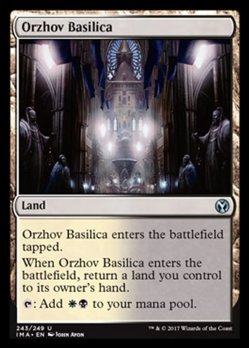 | Oracle Text | Orzhov Basilica enters the battlefield tapped. When Orzhov Basilica enters the battlefield, return a land you control to its owner's hand. {{t}}: Add {{w}}{{b}} to your mana pool. | ||