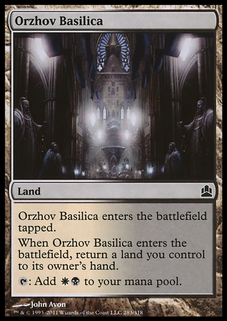 | Oracle Text | Orzhov Basilica enters the battlefield tapped. When Orzhov Basilica enters the battlefield, return a land you control to its owner's hand. {{t}}: Add {{w}}{{b}} to your mana pool. | ||