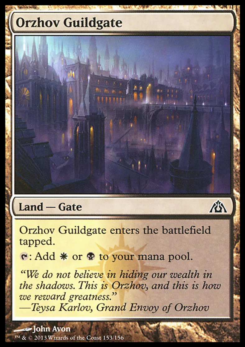 | Oracle Text | Orzhov Guildgate enters the battlefield tapped. {{t}}: Add {{w}} or {{b}} to your mana pool. | ||