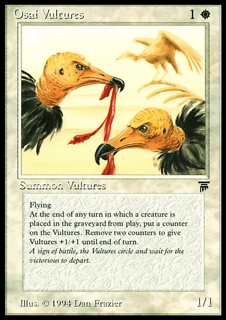 | Oracle Text | Flying At the beginning of each end step, if a creature died this turn, put a carrion counter on Osai Vultures. Remove two carrion counters from Osai Vultures: Osai Vultures gets +1/+1 until end of turn. | ||
