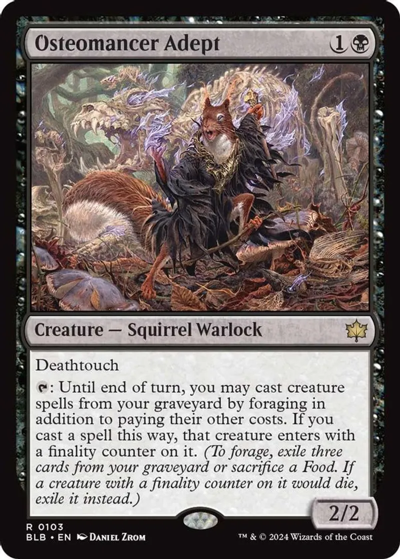 Magic: the Gathering (mtg) Rare creature — squirrel warlock Osteomancer Adept from Bloomburrow (BLB) last updated 2026-02-21 15:23:32
