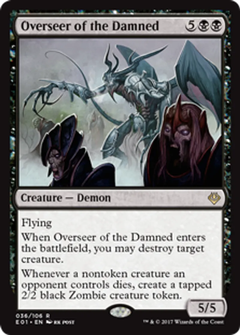 | Oracle Text | Flying When Overseer of the Damned enters the battlefield, you may destroy target creature. Whenever a nontoken creature an opponent controls dies, create a tapped 2/2 black Zombie creature token. | ||