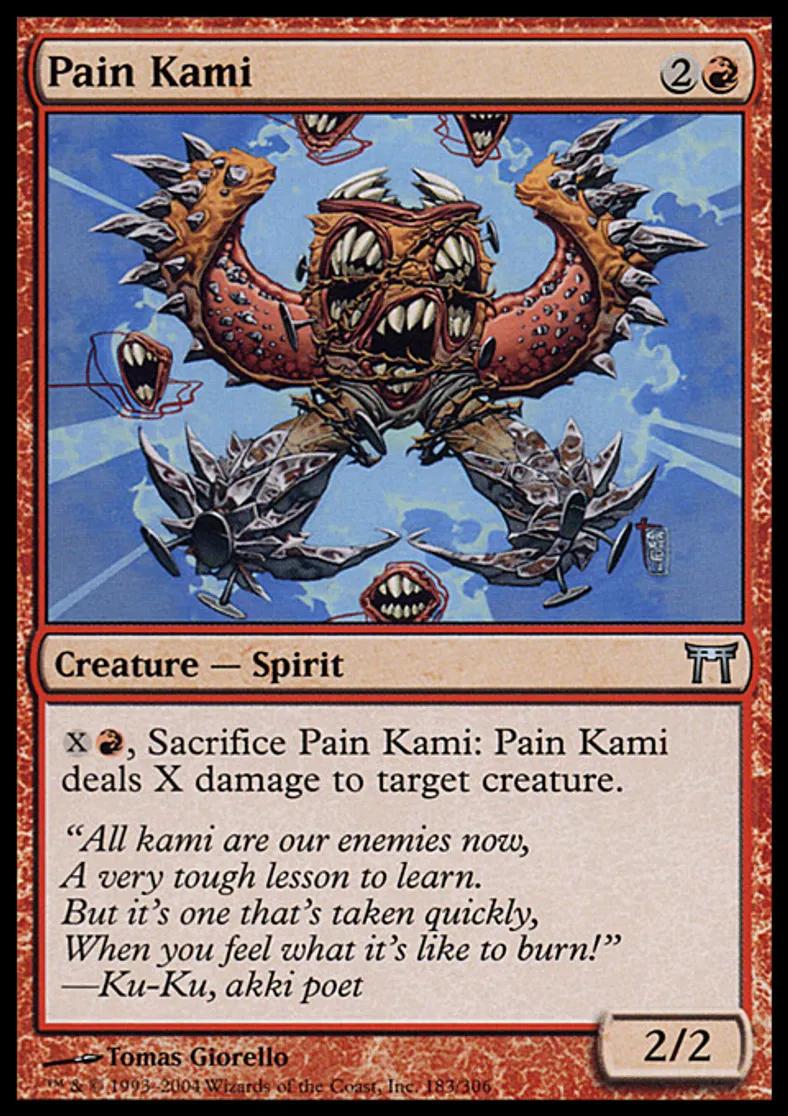 | Oracle Text | {{x}}{{r}}, Sacrifice Pain Kami: Pain Kami deals X damage to target creature. | ||