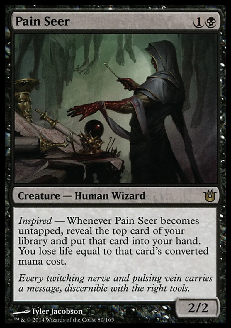 | Oracle Text | Inspired — Whenever Pain Seer becomes untapped, reveal the top card of your library and put that card into your hand. You lose life equal to that card's converted mana cost. | ||